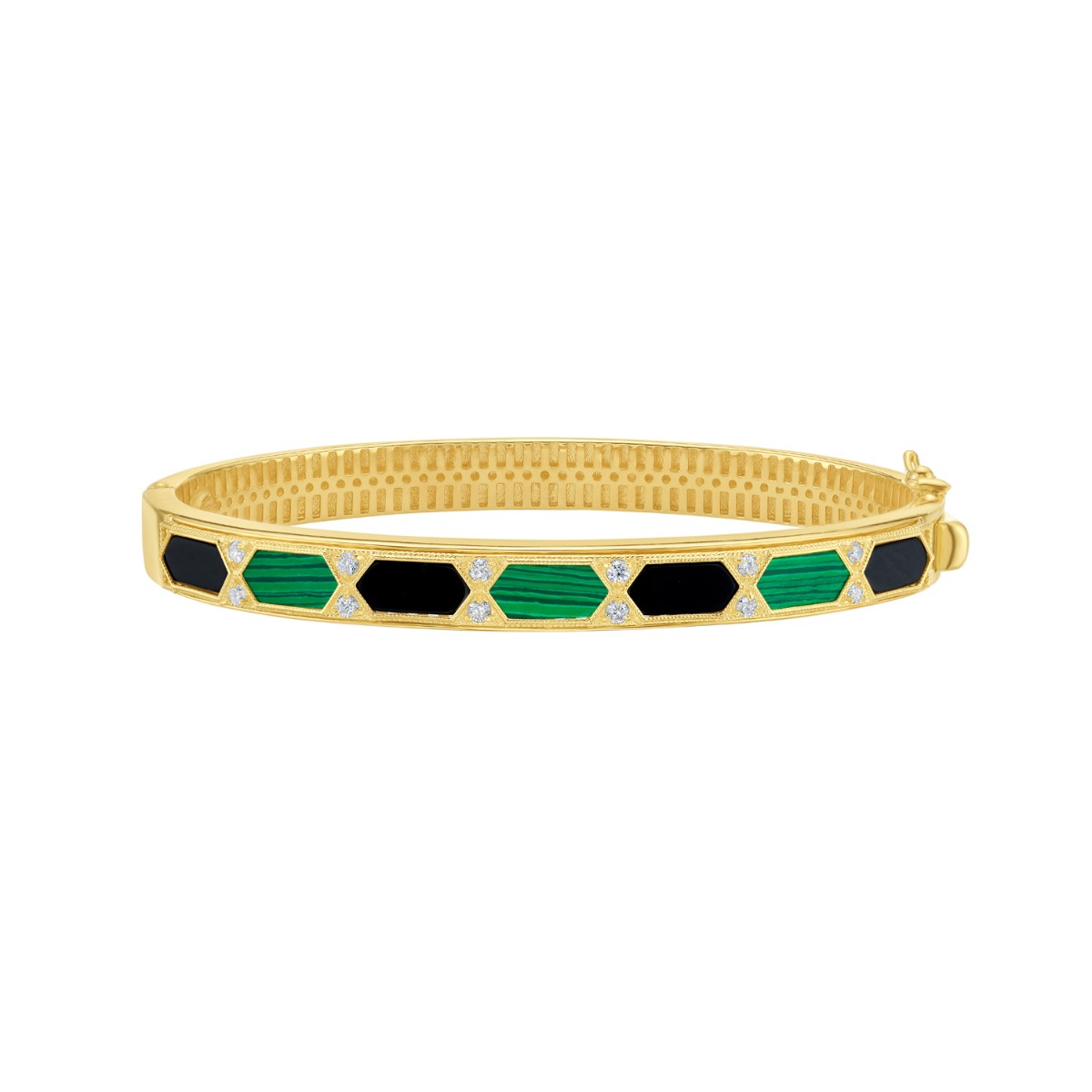 14K Yellow Gold 7.5" .24ct Diamond Black Onyx and Malachite Hexagon Art Deco Bracelet with Special Push (with 1 side Figure 8) Clasp