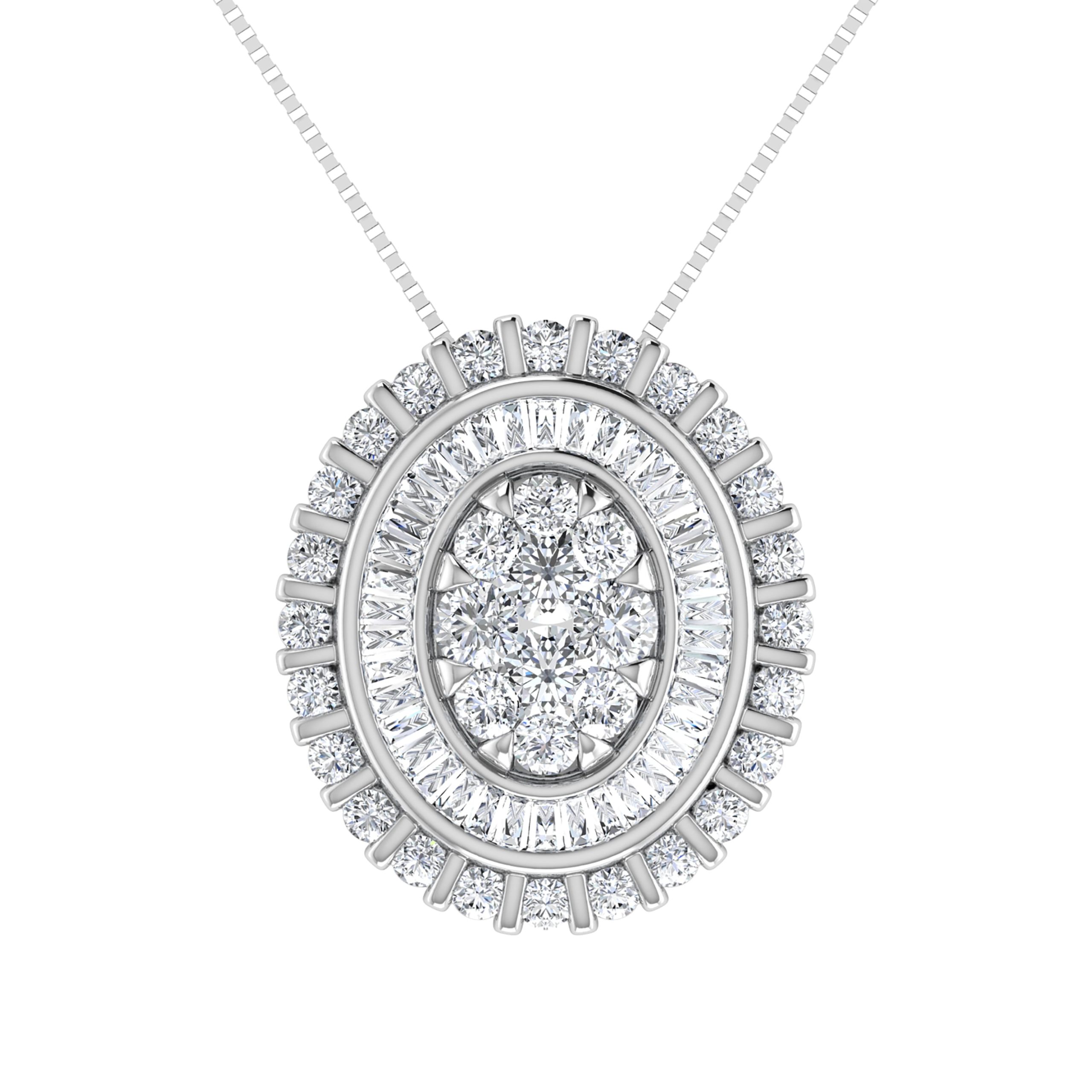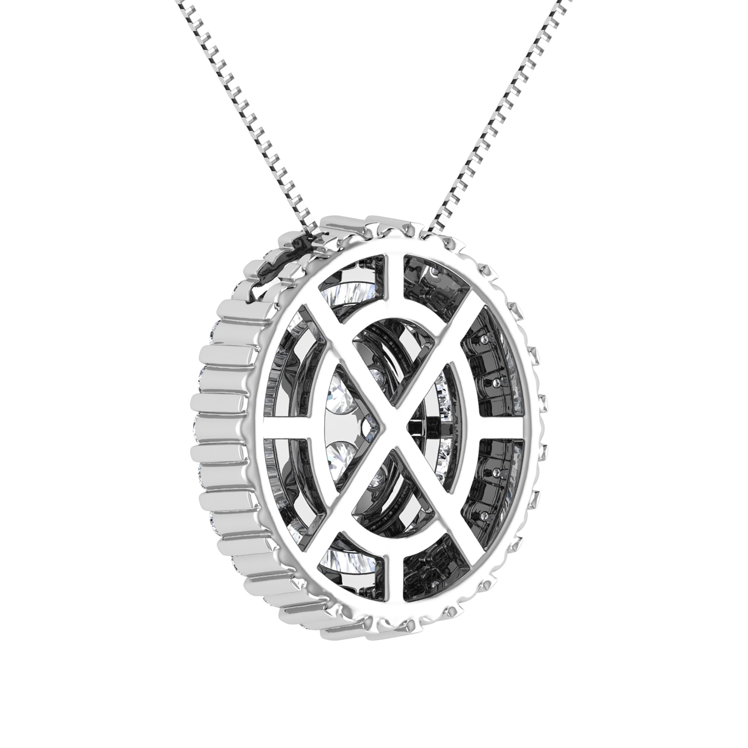A unique oval pendant in 14K white gold featuring 3/4 Ct.Tw. round and tapered diamonds, set invisibly for a seamless shimmer.