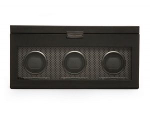 FEATURES -Patented innovation - Every WOLF winder counts the precise number of rotations. All other winders estimate the number of rotations -Rotation options: 10 second start delay. Can be set between 300 and 1,200 TPD (turns per day). Double the amount of TPD by selecting bi-directional setting -Power reserve setting: 6 to 72 hours in increments of 6 hours power reserve setting to accommodate watches with a power reserve, giving the watch time to release stored energy before the winding program begins. -Directional settings: Clockwise, counter clockwise and bi-directional Battery: Option to run on AC power (universal adapter included) or D-Cell/Lithium batteries (not included) -Cuff: Patented lock-in cuff ‘locks’ your timepiece into the rotator drum for a secure fit. Low density foam to accommodate all wrist sizes without putting pressure on your bracelet. Storage: 3 winding modules, 2 piece watch storage (cuff will accommodate up to 52mm case) and travel case Vegan leather