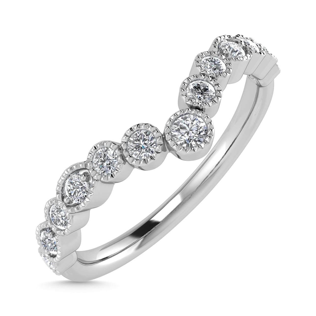Celebrate timeless elegance with this 14K white gold curved wedding band, featuring 1/3 carat total weight of channel-set lab-grown diamonds. The gentle curve is designed to nestle perfectly alongside your engagement ring, while the sleek white gold and sparkling diamonds create a refined and sophisticated look. A symbol of love, craftsmanship, and ethical luxury.