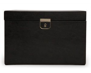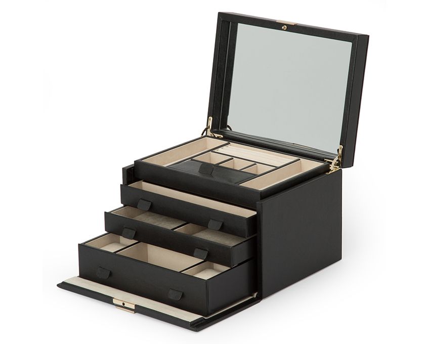 FEATURES -Storage: 4 ring rolls, 1 earring tab, 4 necklace hooks, 3 storage compartments, under lid storage, mirror -LusterLoc™: Allows the fabric lining the inside of your jewelry cases to absorb the hostile gases known to cause tarnishing. Under typical storage conditions, it can prevent tarnishing for up to 35 years.