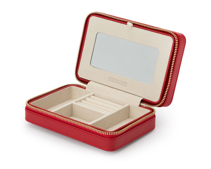 FEATURES -Storage: 4 ring rolls, 1 earring tab, 4 necklace hooks, 3 storage compartments, under lid storage, mirror -LusterLoc™: Allows the fabric lining the inside of your jewelry cases to absorb the hostile gases known to cause tarnishing. Under typical storage conditions, it can prevent tarnishing for up to 35 years.