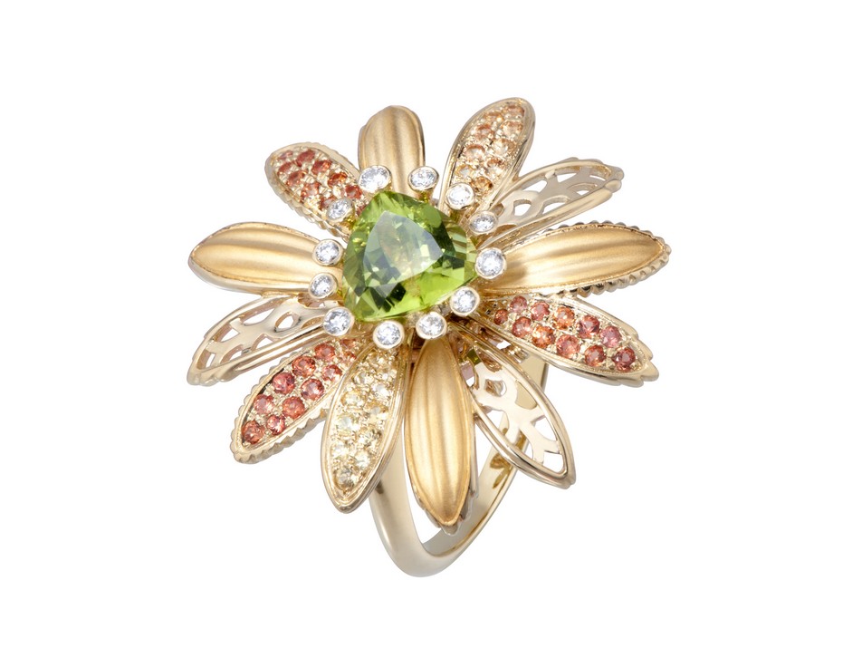 Carrera y Carrera 18K Yellow Gold Margarita small Ring with Orange Sapphires, Olivine and Diamonds